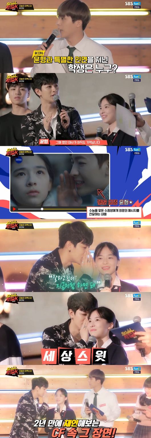아이콘은 무대를 마친 뒤 본격적으로 인사했다. 특히 어택스타가 되고 싶었다던 아이콘은 "꿈을 이뤘다"며 팬들에게 애정을 전했다. 이때, 윤형과 특별한 인연이 있다는 의문의 한 학생이 등장했다. 알고보니 립밤 모델 시절 CF촬영을 함께했던 인연이었다. 윤형은 당시 달달한 맨트로 2년만에 재연해 모두를 심쿵하게 했다.