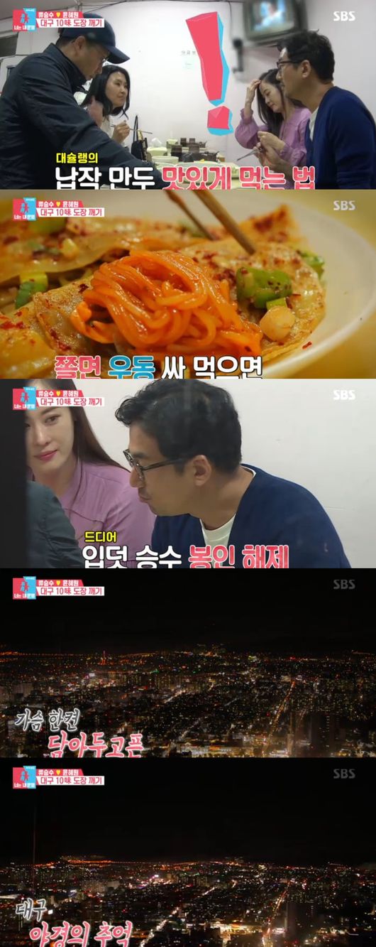 다음은 류승수 윤혜원 부부가 그려졌다. 두 사람은 서둘러 대구로 향했다. 알고보니 대구에서 살고 있는 지인과 함께 대구 미식회 여행을 계획했기 때문. 대구의 명소인 김광석 거리에 이어 짜장면부터 납작만두 등 먹방 여행을 시작했다. 특히 대구에 살고 있다는 지인은 납작만두를 더 맛있게 먹는법이 있다면서, 쫄면과 우동에 싸먹는 신기술을 전수해 지켜보는 이들까지 군침이 돌게 했다.