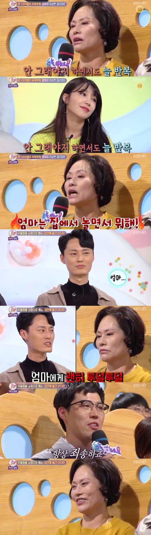 엄마의 막무가내 정리정돈으로 힘든 아들이 출연했다. 사연자는 "친형의 결혼식날 양복을 입고 벨트를 찾아야하는데 없어져서 늦었다"고 말했다. 소개팅하려고 준비해둔 옷도 없어졌고 보풀 제거기, 휴대전화 충전기도 사라졌다고 털어놨다.