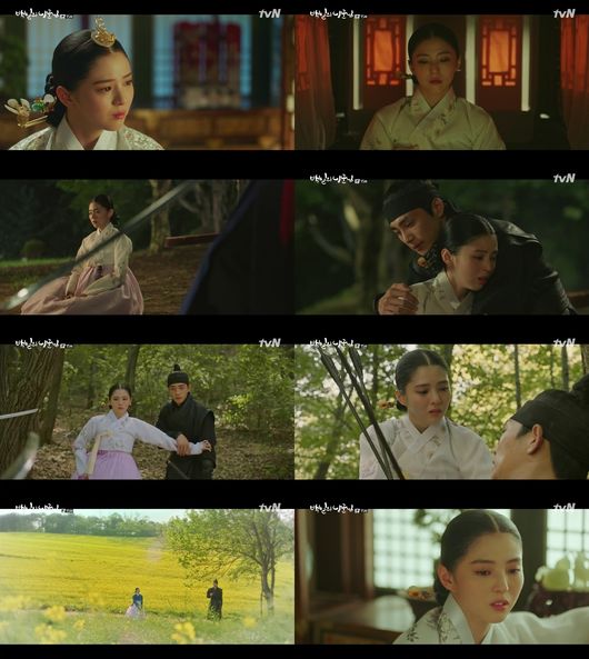 이날 방송에서는 무연(김재영 분)과 도망치는 소혜(한소희 분)의 모습이 그려졌다. 소혜는 그간 세자 이율(도경수 분)의 아이가 아닌 다른 남자의 아이를 배 속에 품고 있음에도 불구하고 이율에게 그 사실을 숨겼던 터. 결국 이날 모든 사실을 알게 된 이율은 소혜를 궁 밖으로 쫓아냈다.