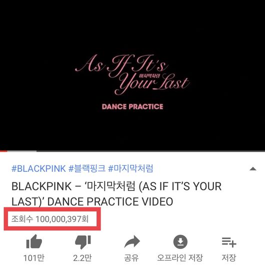 블랙핑크의 ‘마지막처럼’ 안무 영상이 유튜브에서 조회수 1억뷰를 돌파했다.
