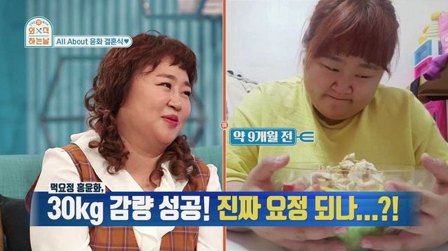 이어 홍윤화는 얼마 전 28kg을 뺀 데 이어 30kg까지 목표치 몸무게 감량에 성공했다고 밝힌다. 오는 11월 17일 결혼식을 앞둔 홍윤화는 ‘외식하는 날’에서 어마어마한 치팅데이를 가지면서도 꾸준한 체중감량을 이어왔다. 다이어트를 시작한 지 약 8개월 만에 최종 목표를 달성해 목선과 V라인이 생겼다며 흐뭇해한다.
