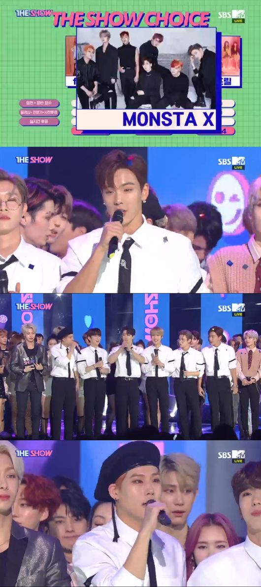 몬스타엑스는 더쇼초이스 수상 1위 직후 "스타쉽엔터테인먼트 관계자에게 감사하다"고 "몬베베 너무 고맙고 많이 사랑한다. 월드투어를 마치고 이렇게 컴백하는데 전세계 몬베베 여러분 저희 응원해주셔서 감사하다"고 수상소감을 전했다.