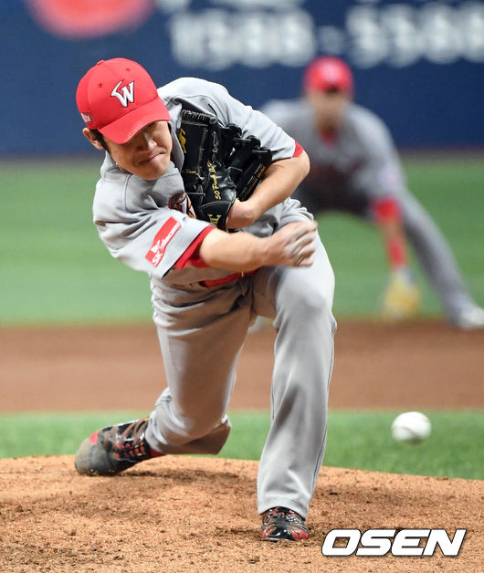 1-2로 뒤진 4회에도 선두 송성문에게 빗맞은 유격수 방면 내야안타를 맞고 또 어렵게 출발했다. 그러나 샌즈 임병욱을 모두 헛스윙 삼진으로 요리하고 평정심을 되찾았다. 이어 2회 적시타를 허용했던 주효상마저 2루수 땅볼로 정리하고 위기를 넘겼다.