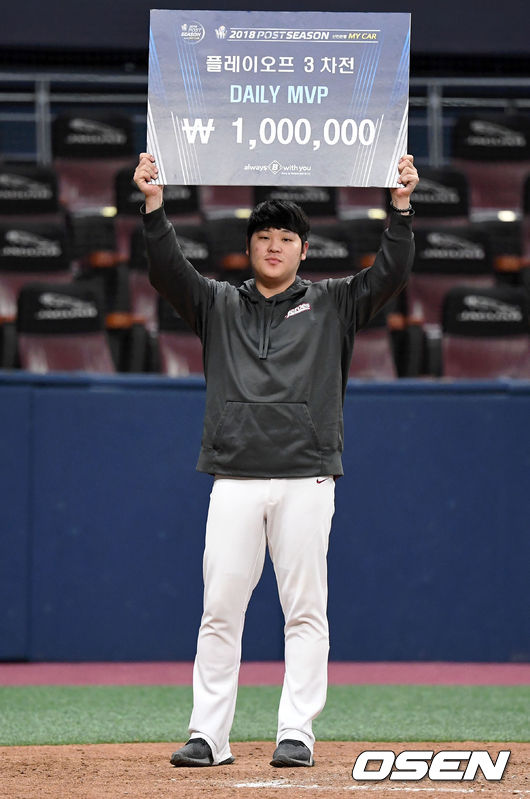 한현희는 30일 고척스카이돔에서 열린 SK 와이번스와의 플레이오프 3차전에 선발 등판해 5⅓이닝 7피안타(2피홈런) 1사구 7탈삼진 2실점 역투를 펼치며 팀의 3-2 승리를 이끌었다. 이날 승리 투수가 되면서 한현희는 데일리 MVP를 수상했다.