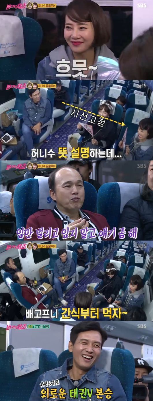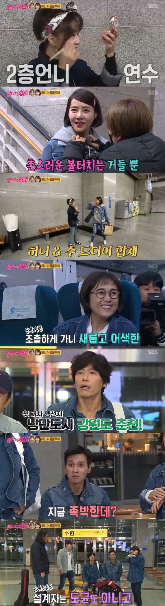 이연수와 강경헌도 다른 정거장에서 만났다. 촌스러움 더하기 위해 강경헌은 깻잎머리에 볼터치를, 이연수도 2층머리와 두건까지 활용해 복고패션으로 돌아갔다. 반가움도 잠시, 얼른 기차에 탑승했다. 허니수의 꿀물투어, 전원이 기차에 탑승했다.