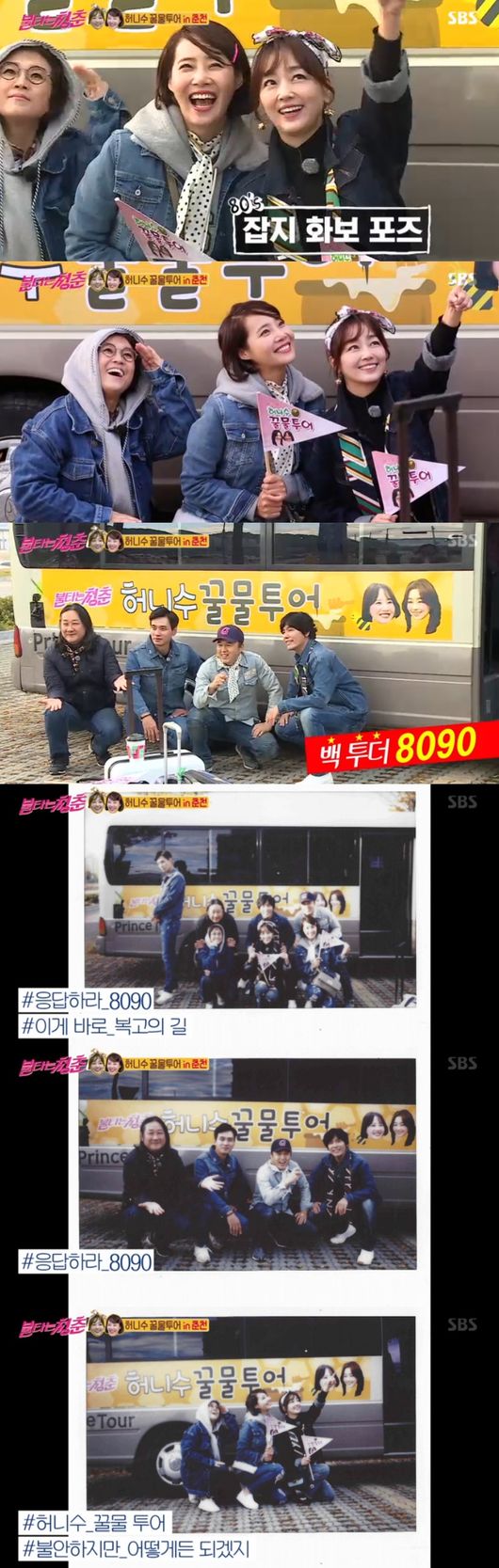 이연수와 강경헌도 다른 정거장에서 만났다. 촌스러움 더하기 위해 강경헌은 깻잎머리에 볼터치를, 이연수도 2층머리와 두건까지 활용해 복고패션으로 돌아갔다. 반가움도 잠시, 얼른 기차에 탑승했다. 허니수의 꿀물투어, 전원이 기차에 탑승했다. 모두 청춘으로 돌아간 듯 기차 여행의 묘미인 간식과 함께 커플매칭을 하며 화기애애하게 기차여행을 즐겼다.