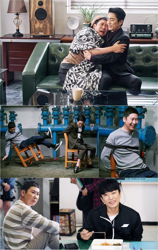 공개된 사진에는 극중과 달리 훈훈한 두 사람의 촬영 현장이 담겨있다. 눈물을 쏟고 있지만 왠지 모르게 웃음을 유발하는 신동엽을 안아주는 정문성. 능청스런 코믹 연기에 웃음을 참지 못하는 정문성의 표정이 시선을 사로잡는다. 채무자들에게 함께 납치돼 창고에 갇힌 장면들에선 신동엽도 터져 나오는 웃음을 참지 못하는 모습이다. 정문성의 코믹한 발재간에 웃음이 제대로 터진 것.