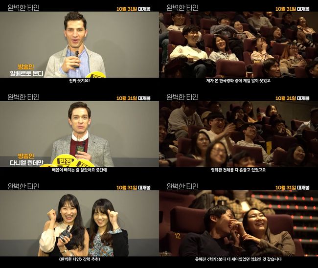셀럽 관객들의 영화평 역시 '완벽한 타인'에 대한 기대를 높인다. '비정상회담'으로 잘 알려진 방송인 다니엘과 알베르토 역시 "지금까지 본 한국영화 중 최고"라고 자신하며 엄지를 치켜세우는 모습.