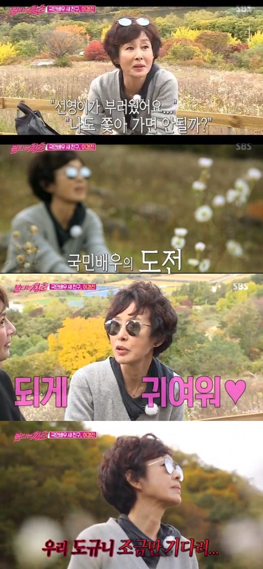 연기 경력 40년의 ‘국민배우’ 이경진이 ‘불타는 청춘’에 오게된 건 박선영 덕분이었다. 드라마 ‘파도야 파도야’에서 호흡을 맞췄던 두 사람. 이경진은 “‘파도야 ’파도야‘ 촬영이 힘들었다. 9개월 동안 쪽잠 자면서 대사를 외우는데 선영이가 먼저 녹화를 끝내고 ’불청‘을 가더라. 그게 부러워서 ’너 좀 쫓아가면 안 되냐‘고 물었는데 그게 이야기가 돼 여기까지 오게 됐다”고 새 친구 합류 과정을 설명했다.