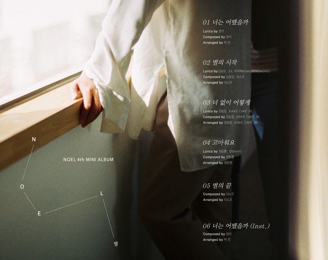 공개된 트랙리스트 이미지에는 노을의 미니앨범 ‘별’에 수록될 여섯 곡의 제목이 나열되어 있다. 먼저 정키와의 컬래버 소식이 전해지며 관심을 모았던 타이틀곡 ‘너는 어땠을까’를 시작으로 강균성이 작사 작곡에 참여한 ‘별의 시작’, 따뜻한 겨울을 배경으로 펼쳐지는 미디엄 템포 발라드 ‘고마워요’ 등 제목만으로도 감성적인 분위기 물씬 풍기는 곡들이 눈길을 끈다.