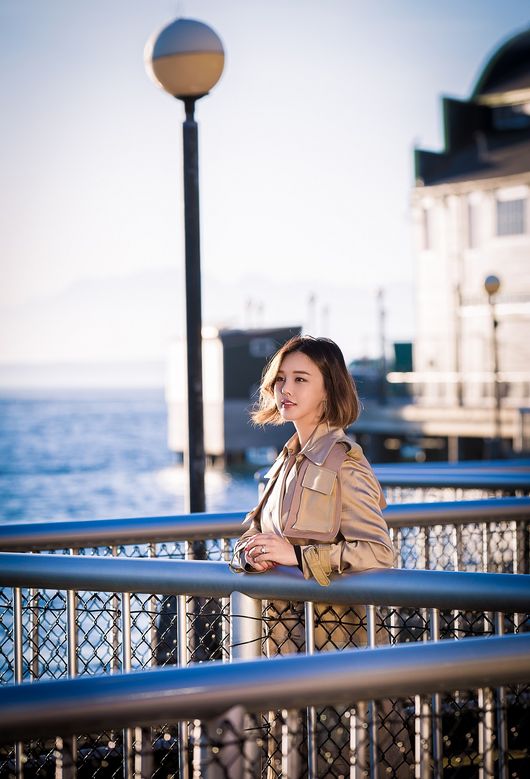 또한 큰 키와 어울리는 골드와 베이지가 섞인 트랜치 코트와 짧은 단발머리는 고혹적이면서도 세련미를 물씬 풍기며 보는 이들의 눈길을 사로잡는다.
