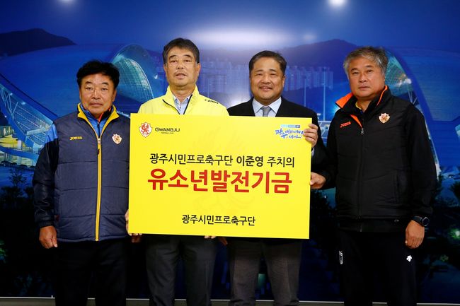 광주는 1일 낮 12시 구단 사무국에서 기영옥 단장 및 최수용 U-18 감독, 박창석 U-15 감독, 이준영 주치의 등이 참석한 가운데 광주FC 유소년 발전 기부금 전달식을 가졌다.