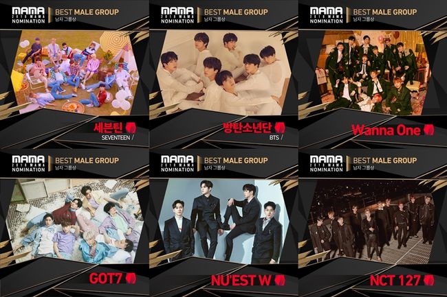 남자 그룹상에는 세븐틴, 방탄소년단, 뉴이스트W, 워너원, NCT127, 갓세븐이 후보로 올랐다. 국내는 물론 해외에서도 너른 인기 끌고 있는 K-POP 주축 그룹들이 이름을 올렸다.