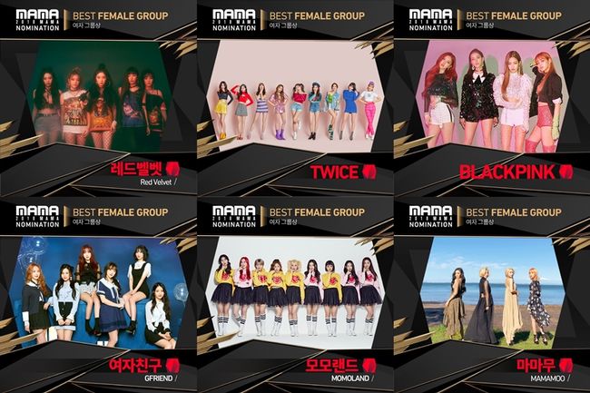 여자 그룹상 후보에는 여자친구, 모모랜드, 마마무, 트와이스, 레드벨벳, 블랙핑크가 올랐다. 올 한 해 음원차트를 휩쓸며 국내를 넘어 해외 인기까지 착실히 다진 걸그룹들의 맞대결이 기대된다.