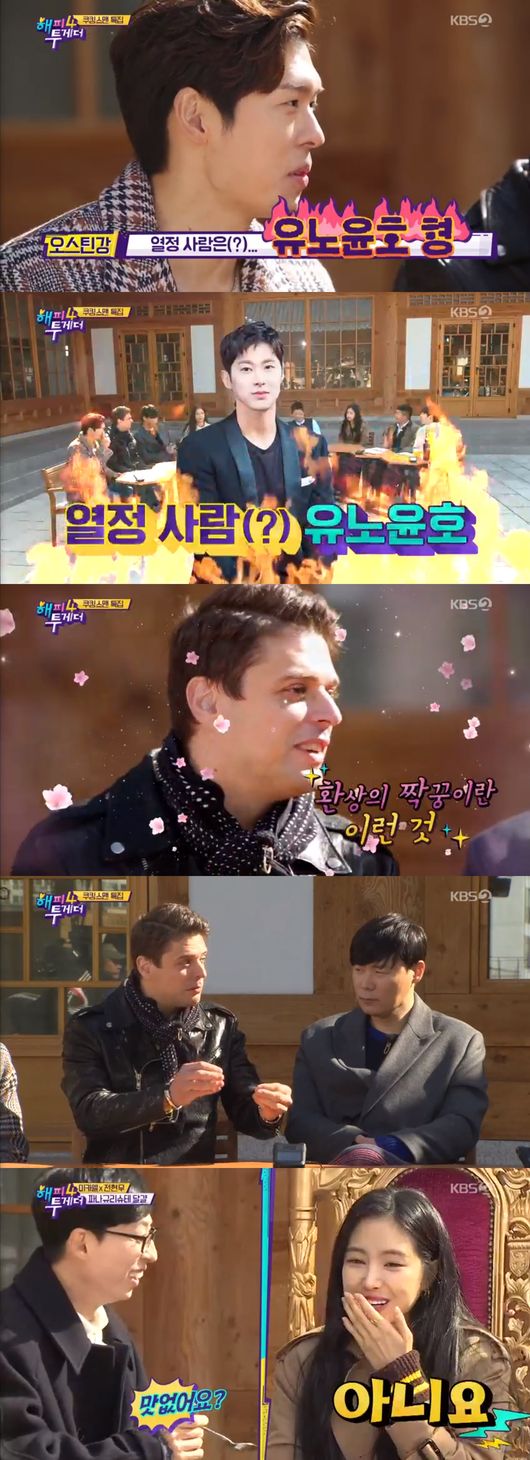 오스틴 강은 MBC '두니아' 촬영 비하인드를 전해 눈길을 끌었다. 오스틴 강은 "사이판에서 일주일 동안 촬영했다. 촬영가면 좀 힘들지 않냐. 빡세다. 다들 기절하는데 윤호 형은 '열정!', '화이팅!'이라고 한다. 그런데 차에서 대기할 때 기절한다"며 "괜찮냐고 하면 일어나서 괜찮다고 하면서 다시 파이팅한다. 우리는 다 피곤해서 있는데 유노윤호는 여러 번 촬영에도 열정적으로 하더라"라고 했다.