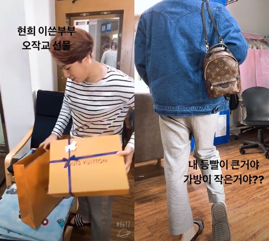 홍현희, 제이쓴 부부의 선물은 고가의 가방. 김영희는 즉석에서 가방을 착용해 본 후 “내 등빨이 큰 거야, 가방이 작은 거야?”라며 재치 있는 인증샷을 공개해 웃음을 자아내고 있다.