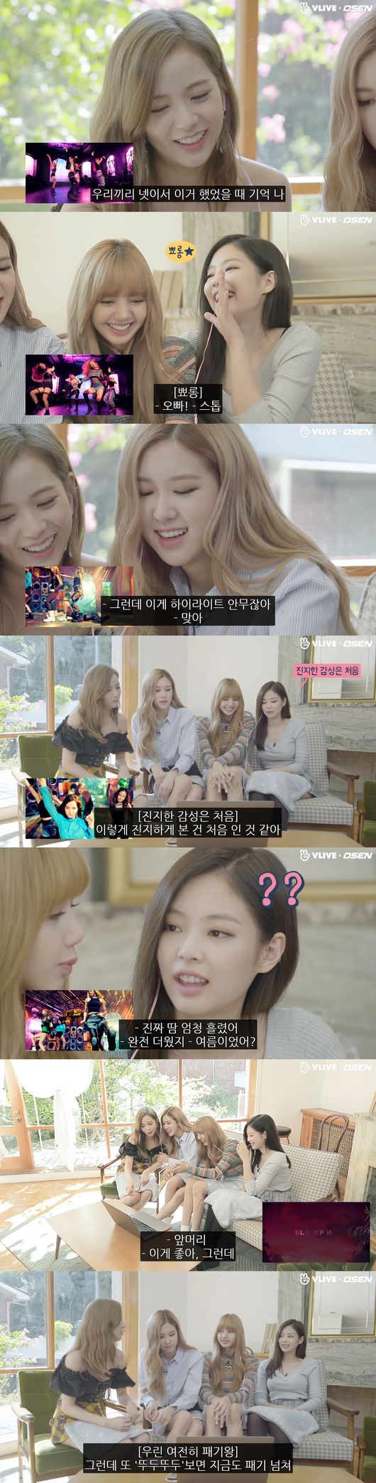 지수는 "우리 너무 패기 넘친다. 이 뮤직비디오를 이렇게 진지하게 본 건 처음인 것 같다. 오랜만에 보니까 처음 보는 장면이 있는 것 같다"며 미소 지었다. 리사는 "지수 언니가 개인 촬영을 10시간 동안 했다. 난 덕분에 14시간 동안 잤다"고 말해 눈길을 끌었다.
