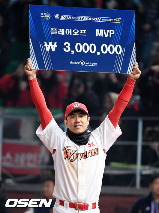SK 베테랑 김강민이 플레이오프 MVP를 차지하며 팀을 한국시리즈에 올려놓았다.