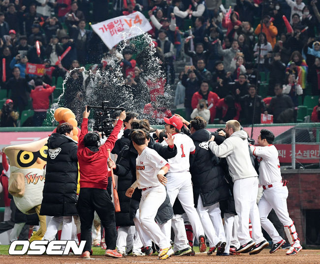 한국시리즈 진출 플래카드를 들고 도열한 SK 선수들의 얼굴에서는 뭔가 말로 설명할 수 없는 감정이 느껴졌다. 선수들은 한동안 흥분을 가라앉히지 못하고 덕아웃에서 환호성을 질렀다. 한 선수는 “뺨 한 번 때려 달라. 이게 진짜인지 실감이 나지 않는다”며 극적인 승부에 취한 선수단 분위기를 대변했다.