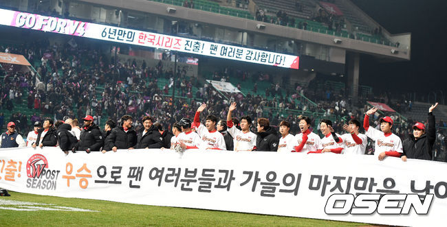 SK는 2일 인천SK행복드림구장에서 열린 넥센과의 플레이오프 5차전에서 극적인 끝내기 승리를 거두고 한국시리즈에 진출했다. 3·4차전에서 패하며 오히려 궁지에 몰린 SK는 9-4로 앞선 9회 5실점, 연장 10회 1실점하며 탈락 위기에 몰렸다. 그러나 연장 10회 반격에서 김강민 한동민의 극적인 백투백 홈런에 힘입어 넥센을 물리치고 한국시리즈에 나갔다.