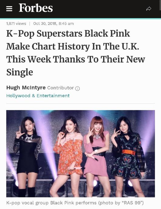 지난 30일(현지 시간) 미국 경제 전문지 포브스(Forbes)는 “K팝의 슈퍼스타인 블랙핑크가 영국에서 차트 역사를 만들다(K-Pop Superstars Black Pink Make Chart History In The U.K. This Week Thanks To Their New Single)”라는 제목의 기사를 통해 블랙핑크의 영국 오피셜 싱글 차트 진입 성과를 집중 조명했다.