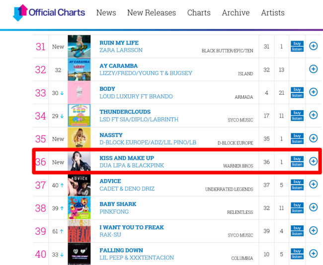 포브스는 “오피셜 싱글 차트 톱 100(Official Singles Chart Top 100)에 두아리파와 블랙핑크의 콜라보 곡인 ‘Kiss and Make Up’이 36위에 데뷔했다”면서 “이는 블랙핑크가 ‘뚜두뚜두’로 78위에 진입 이후 두 번째 진입”이라고 전했다.
