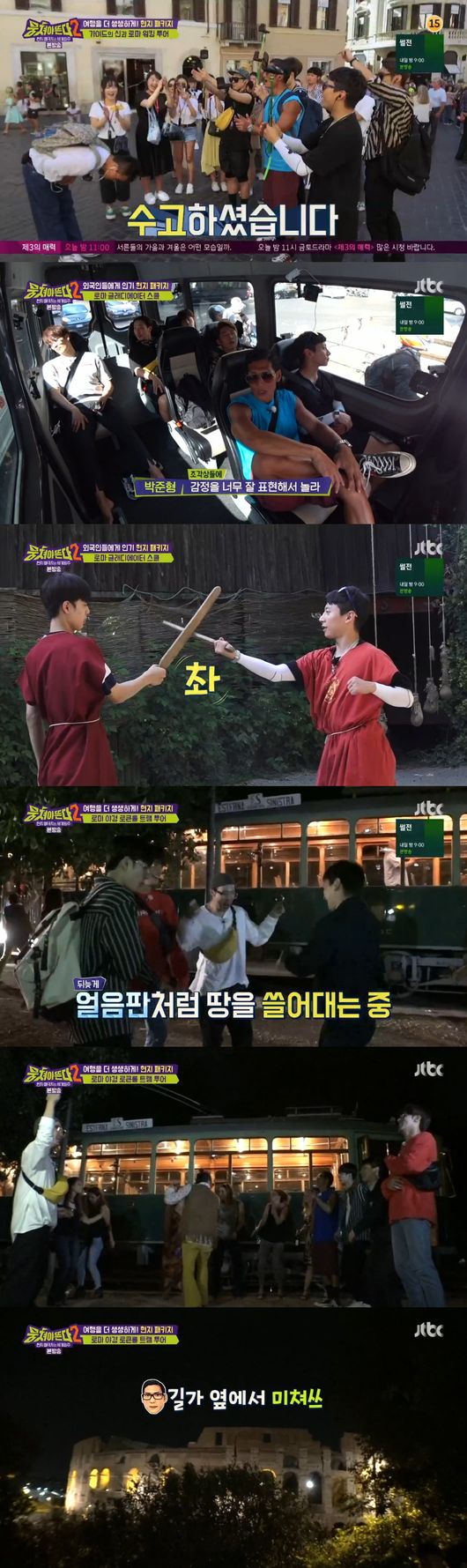 ‘히스토리 워킹 투어’를 시작으로 산뜻하게 마친 로마 현지 패키지 투어. 이어 멤버들은 스페셜 투어로 글래디에이터 스쿨에 입성했다. 신기함과 반가움도 잠시, 고막을 때리는 기합소리와 함께 갑작스럽게 시작된 글래디에이터 훈련이 모두에게 당황감과 피로를 안겼다.