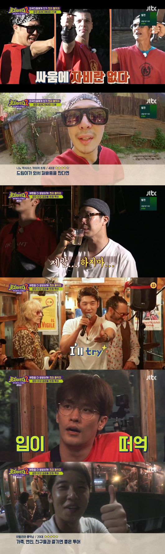 이들은 로마 글래디에이터 스쿨에 들어가 한순간에 노예 신분으로 전락했다. 자코모 교관은 영어로 검투 하는 방법을 설명했는데 알아듣는 사람은 박준형 뿐이었다. 그도 “이탈리아어가 섞인 영어인 데다 너무 덥고, 모기가 물어서 정신이 하나도 없다”고 이해하지 못했다고 털어놨다.