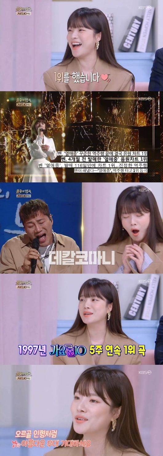 오랜만에 불후의 명곡에 출연한 벤은 ‘열애중’이 역주행 1위를 달성한 것에 대해 많은 축하를 받았다. 벤은 지난 4월 발매한 첫 정규앨범 타이틀 곡 ‘열애중’으로 발매 116일 만에 1위를 차지하며 역주행의 아이콘으로 등극했다.