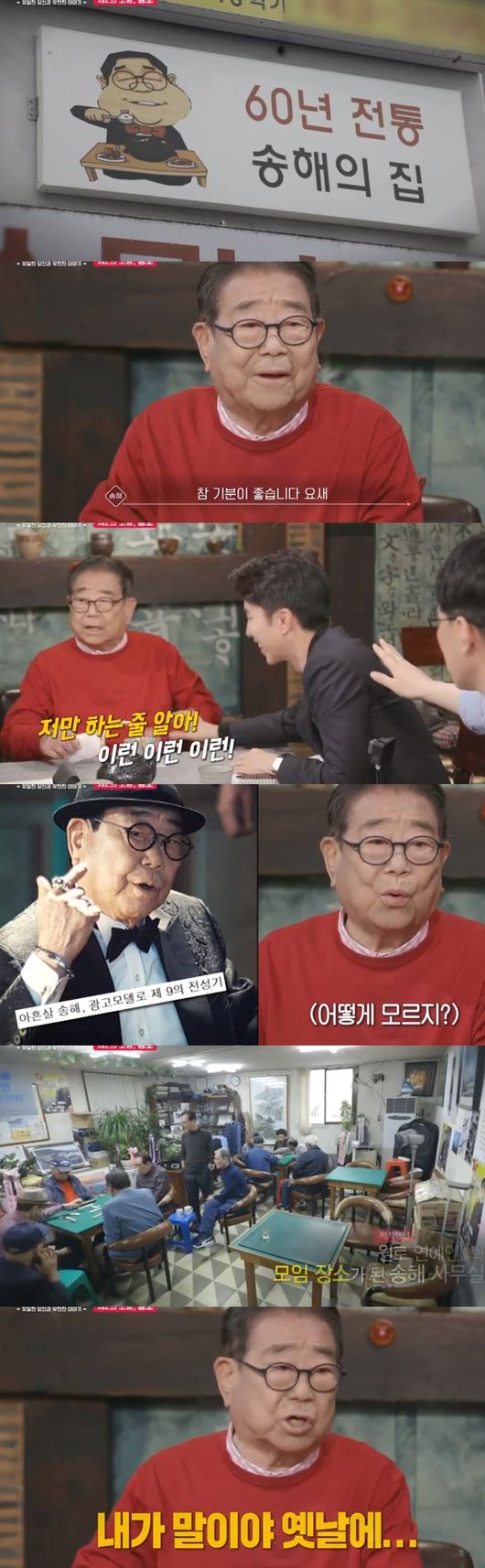 이어 송해는 "화려한 시기를 지나고 나면 밖에 나오기를 주저하는 분들이 많다. 그런데 나도 연예계에서 선배 축에 들다보니까 내 사무실에서 모이자고 해서 모이고 있다. 원로 연예인들이 나와서 바둑도 두고 그런다. 잘했다고 자부하는 건 치매 걸린 환자가 없다. 와서 노니까 신경이 쉴 사이가 없다. 저녁 6시 이후에는 강제 해산한다. 그 나이들 돼서 저녁에 휘청거리면 안되니까. '내가 말이야 옛날에' 그런 말 하면 안되니까"라고 말했다.
