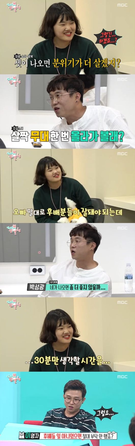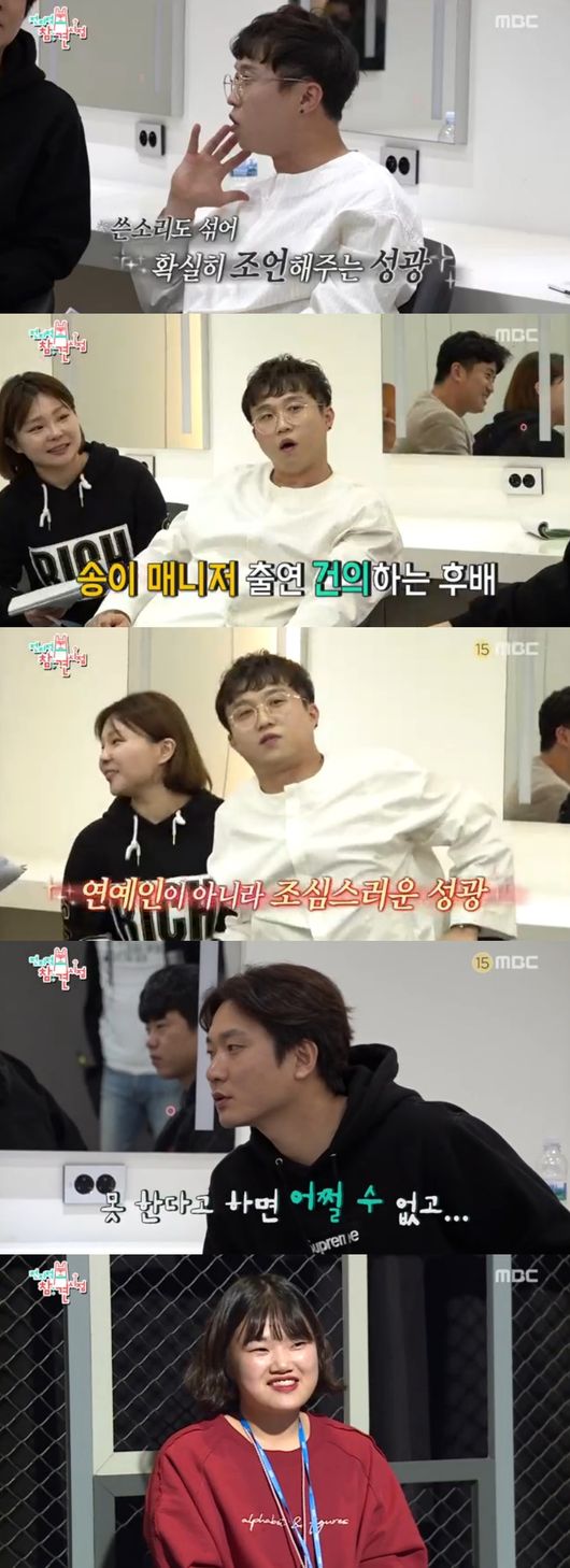 이어 후배들과 함께 대본을 꼼꼼히 살폈다. 선배의 피드백에 분위기가 무거워졌다. 이때, 후배들은 도와다랄며 송이 매니저 출연을 건의했다.하지만 송이매니저 의사가 관건인 것. 박성광은 "연예인이 아니라서"라며 주저했다. 후배들은 도와주고 싶지만, 송이에겐 부담주고 싶지 않은 두가지 마음이 공존했다.