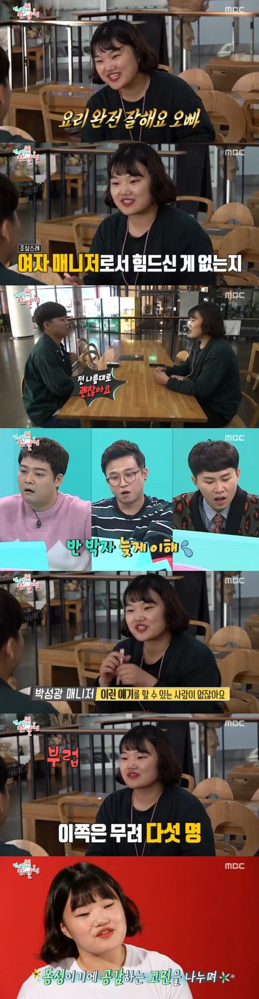 송이매니저는 유민상 매니저와 함께 커피심부름을 갔다. 이때, 유민상 매니저에게 "여자 매니저로 힘든 점이 없냐"며 물었다. 유민상 매니저는 "처음에 이상하게 보지 않을까 힘들었다"면서 남자 비율이 높은 매니저 직업군에 대한 고충을 전했다. 하지만 이제 괜찮아 졌다고. 송이매니저는 "저는 그날이 제일 힘들다"면서 여자들만 아는 고충을 전했다. 전혀 생각도 못했던 송이의 힘든점을 듣게 된 박성광과 남자 MC들은 놀랐다. 이와 달리 송은이와 이영자는 바로 이해했다. 송이 매니저는 "주위에 여자매니저가 없다"면서 동성 매니저이기에, 마음 편히 이야기 나눌 수 있었던 상담이었다며 편안해했다.