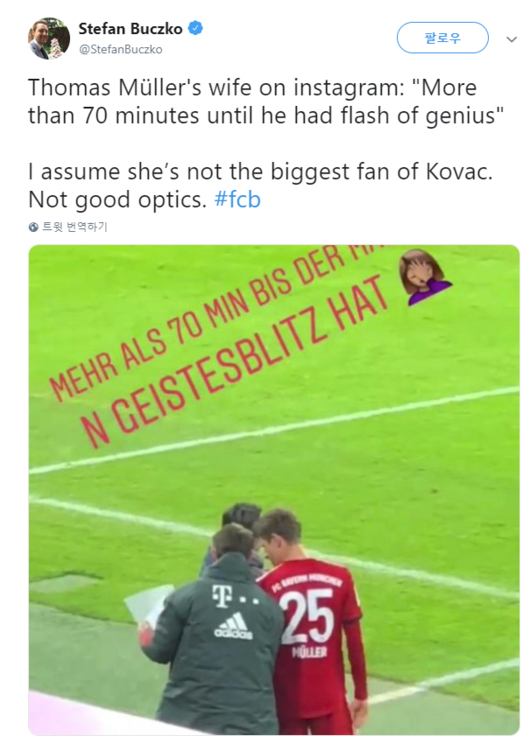 하지만 VIP석에서 경기를 관람하던 리사 뮐러는 자신의 SNS에 교체 투입 당시 뮐러와 코바치 감독의 사진을 올리며 남편의 투입이 늦었다고 불만을 터트렸다.