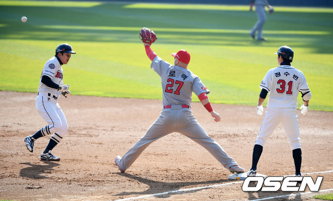 1회초 김강민의 볼넷, 한동민의 홈런으로 2점을 내준 두산은 1회말 선두타자 허경민이 볼넷을 골라내며 반격의 발판을 마련했다. 이어 정수빈이 우익수 앞으로 타구를 날렸다. 우익수 한동민이 달려오며 공을 향해 팔을 뻗었다. 조명탑 그림자 부분에 떨어지면서 원바운드 캐치와 노바운드 캐치 구분이 어려웠던 상황. 허경민은 아웃이라고 판단해 1루로 귀루했다. 그러나 뒤늦게 우선심이 안타라는 신호를 보냈다. 1,2루 사이에서 방황했던 허경민은 아웃이 됐다.