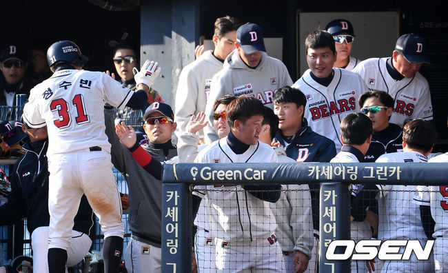 이로써 정수빈은 지난 2015년 10월 21일 잠실에서 열린 플레이오프 3차전 이후 9경기 연속 득점 행진을 이어갔다. 이는 포스트시즌 연속 득점 신기록이다. / bellstop@osen.co.kr