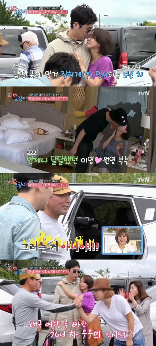 늘 달달한 모습을 보여줬던 최원영 심이영 부부는 따로 여행을 하기 전에 포옹을 하고 입을 맞췄다. 이 모습을 본 이봉원은 "그렇게 하는 거 아니야"라며 역정을 내 웃음을 안겼다.