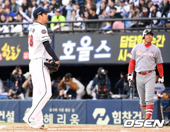 와인드업 자세에서 키킹 동작에서 잠시 멈추는 투구폼으로 바꾼 린드블럼은 1회 한동민에게 투런 홈런, 6회 박정권에게 투런 홈런을 맞았다. 롯데 시절과 달리 올해 넓은 잠실구장을 홈으로 사용하면서 피홈런(16개)이 대폭 줄었으나, 한국시리즈 1차전에서 홈런 2방을 맞았다.