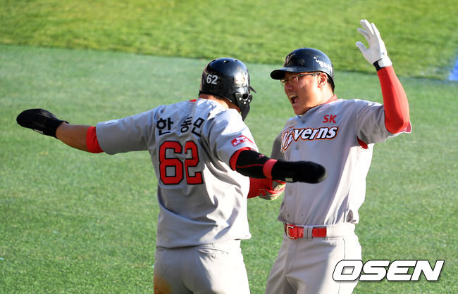한숨을 돌린 SK는 9회 상대 실책성 플레이와 실책을 등에 업고 2점을 더 보태며 승리를 완성시켰다. /skullboy@osen.co.kr
