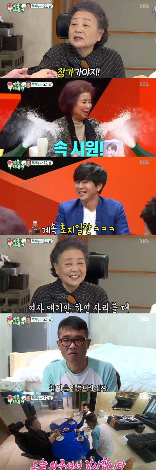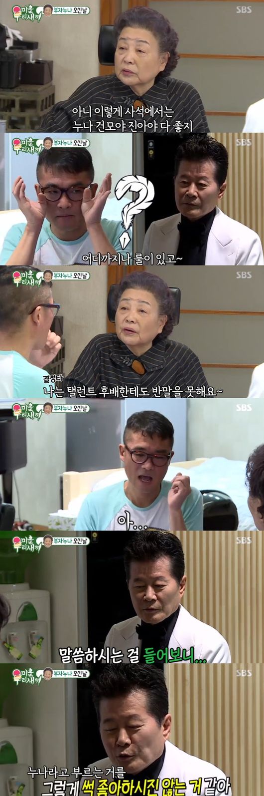 김건모가 강부자에게 누나라고 호칭, 강부자는 처음과 달리 "사석에선 좋지만, 사회에선 규범있게 해야한다"면서 자신은 후배에게 반말을 못한다고 했다. 이를 눈치 챈 태진아는 "누나 호칭을 썩 좋아하지 않는 것같다"며 받아쳤고, 웃음 속에서 '부자누님'으로 호칭을 정리했다.