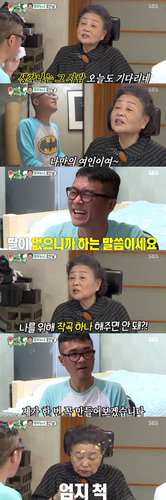김건모는 부엌에서 쭈꾸미를 넣은 라면을 끓였다. 강부자는 냉장고 속 김치통을 그대로 꺼낸 김치를 보자마자 웃음이 터졌다. 강부자는 "부인이 있었으면 예쁜 그릇에 줬을 텐데"라면서 계속해서 빨리 결혼해서 아이를 낳으라고 했다. 평소 강부자가 김검모 팬이라는 강부자가, 엄마 입장에서 애정어린 조언을 남긴 것.