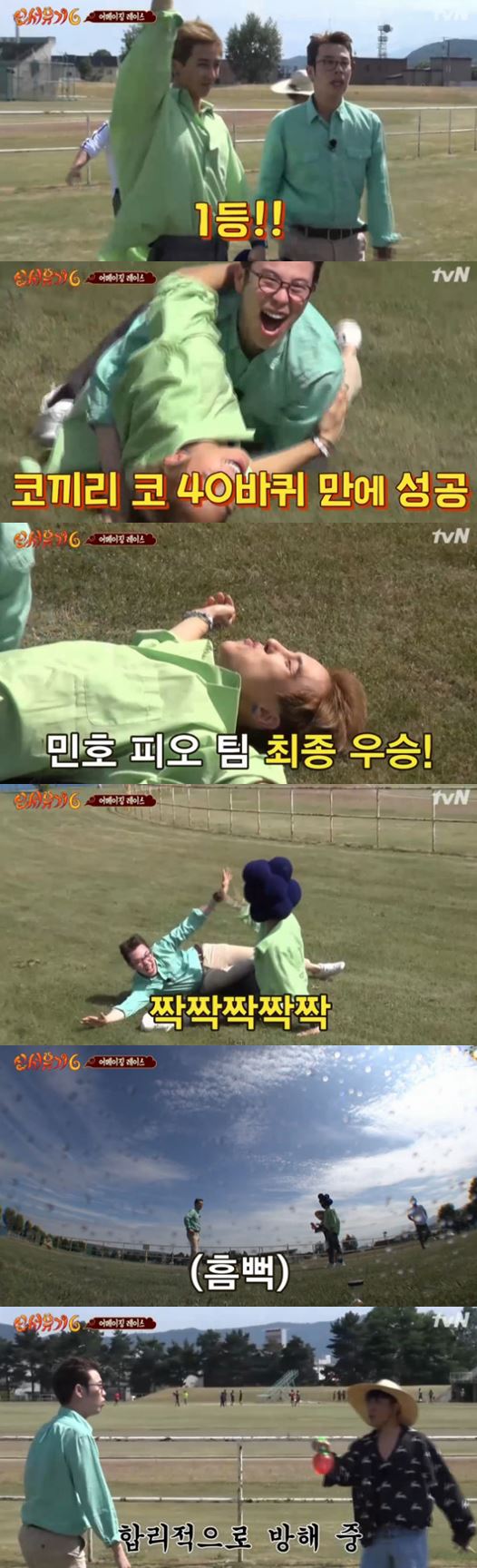 이처럼 '척하면 척' 맞는 호흡으로 부동의 1등를 이어간 송민호 피오는 마지막 미션인 '코끼리 코로 10바퀴 돈 후 3초 안에 하이파이브 하기'에서 고전했고, 그럼에도 끈질긴 도전으로 최종 우승을 차지해 환호했다.