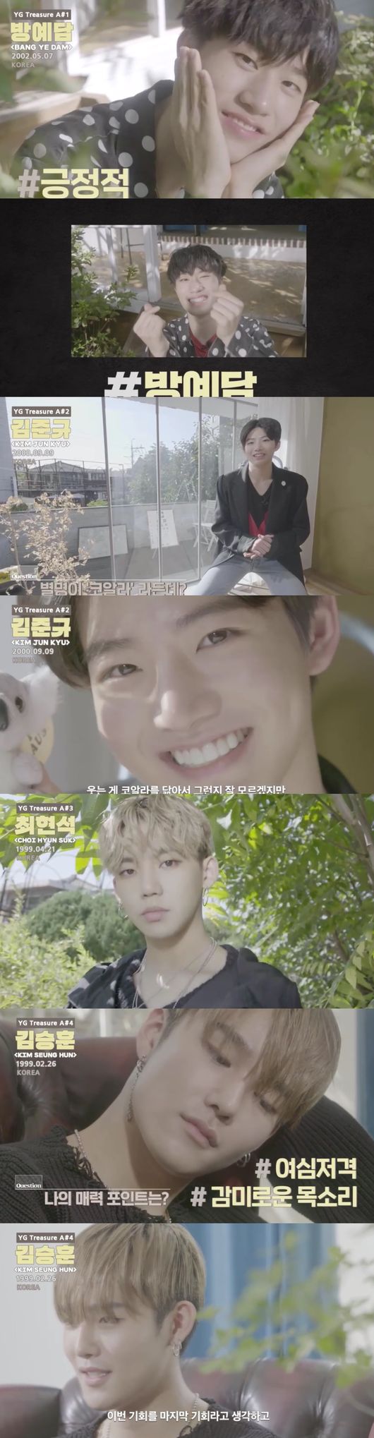 오늘 공개된 영상에는 ‘케이팝스타’ 시즌 3의 준우승자로 당시 12살 소년이었던 방예담을 포함하여 A조에 포함된 7명의 신상 정보와 인사말 그리고 각자를 대표하는 퍼포먼스 실력이 공개됐다.