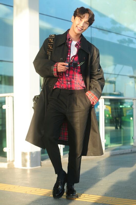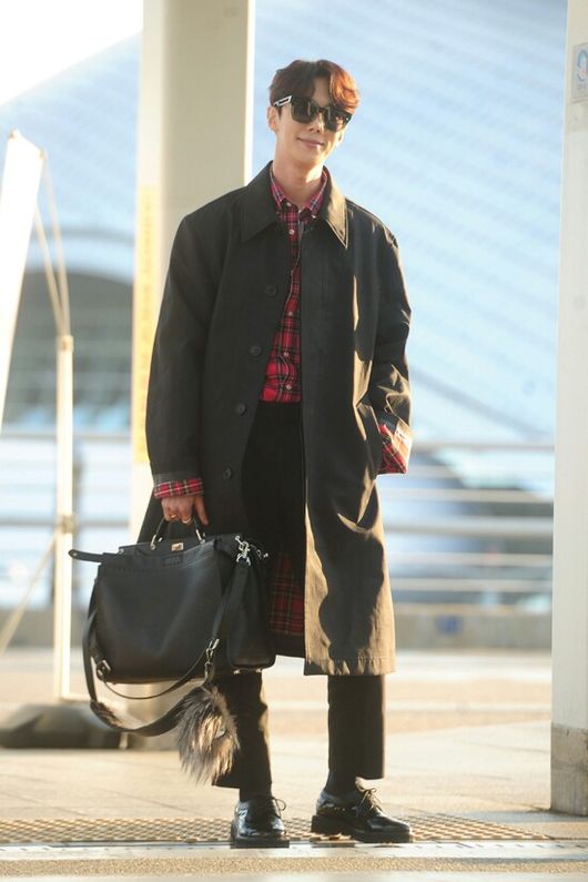이날 박정민은 가을 분위기가 물씬 나는 레드 컬러의 체크 셔츠와 블랙 코트로 캐주얼하면서도 스타일리시한 공항 패션을 완성시켰다.