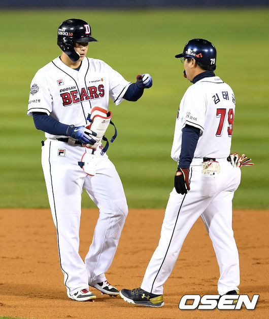 지난해 한국시리즈 타율 2할1푼1리(19타수 4안타) 1홈런 3타점에 그쳤던 김재환은 1차전서 4타수 1안타에 그쳤다. 7회 내야 안타를 때린 게 전부였다.
