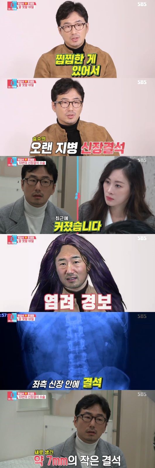 10번의 쇄석술을 거친 류승수의 상황은 의사도 “이례적인 일”이라고 말할 만큼 특이한 경우였다. 그는 “내 몸속에 시한폭탄을 가지고 있는 상태로 생활하는 것이라 긴장된다”며 “해외 촬영이 잡히면 두려움 그 자체다. 가기 전에 무조건 검사를 하고, 진통제를 가져간다”고 신장결석의 고통을 전해 아내 윤혜원을 안타깝게 했다.