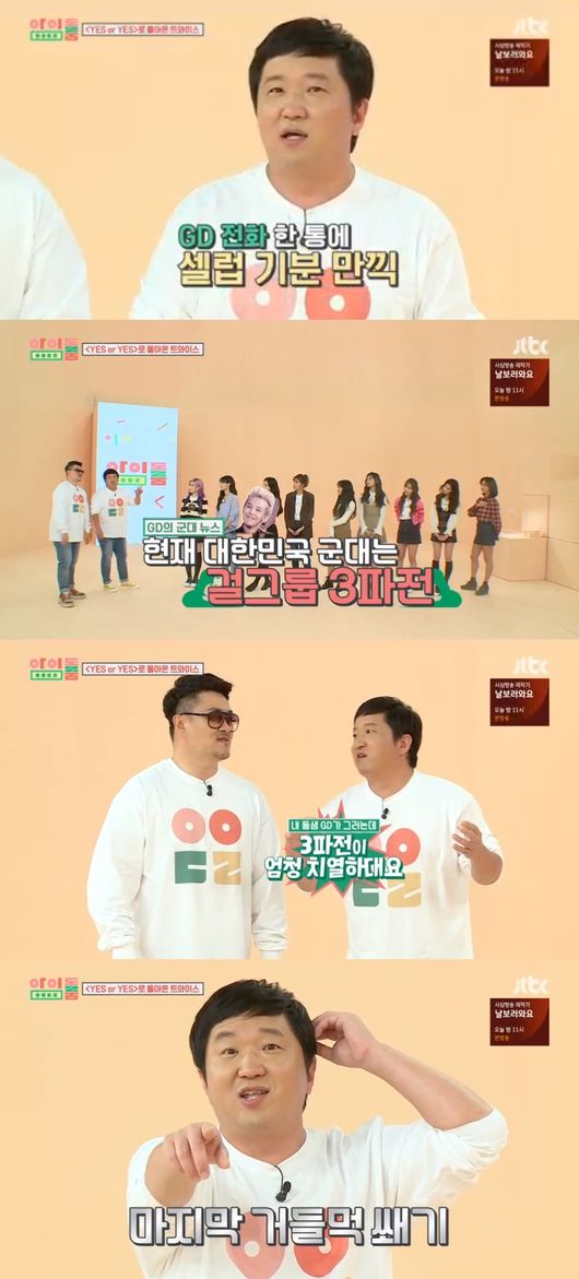 정형돈은 6일 오후 방송된 JTBC '아이돌룸'에서 "군에서 지드래곤과 전화를 했다"며 "지드래곤도 사람이었다. 지드래곤이 군에서 레드벨벳과 트와이스와 블랙핑크가 걸그룹 3파전이다라고 말했다"고 했다.