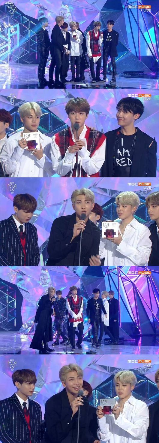 방탄소년단은 6일 오후 7시부터 인천 남동체육관에서 진행된 '2018 MGA (MBC플러스 X 지니뮤직 어워드)'에서 남자 그룹상을 받았다. 앞서 댄스상과 인기상에 이은 3관왕의 영광을 안게 됐다.