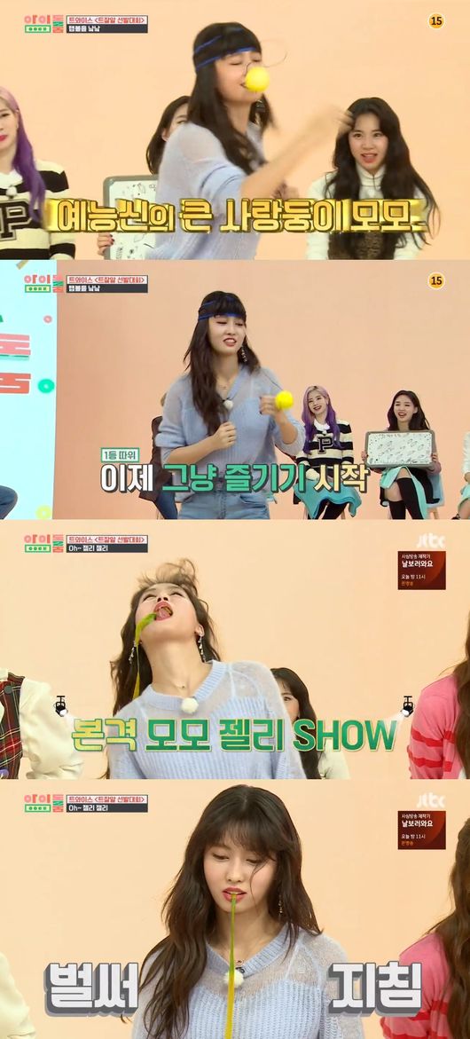 모모의 몸개그는 젤리 먹기와 탭볼 치기에서도 빛이 났다. 젤리를 먹으면서 몸부림을 치는 모모는 산발이 된 머리로 또 한 번 웃음을 줬다. 모모는 탭볼치기에서도 자신감을 드러냈지만 허당스러운 매력을 보여주면서 웃음을 자아냈다.