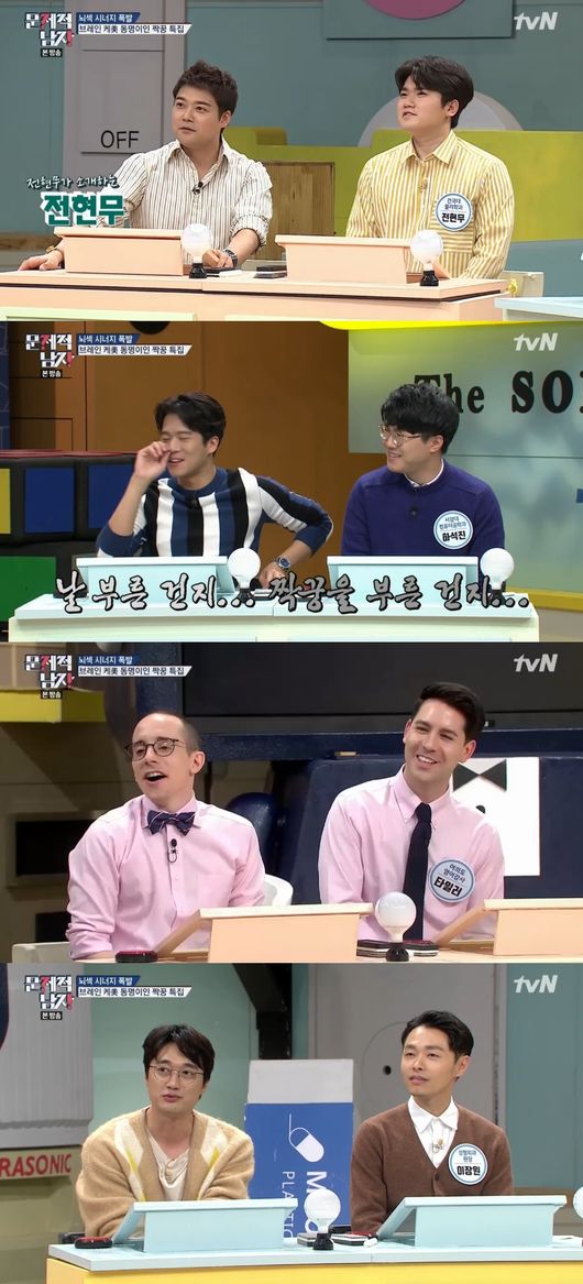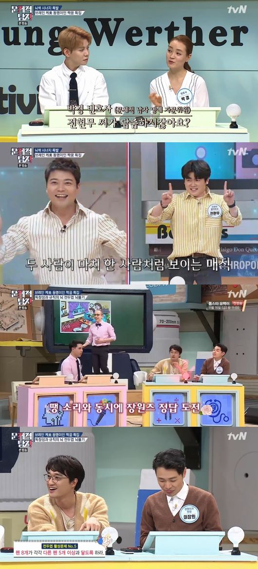 전두엽 활성문제 다섯 번째는 만만치 않았다. 펜 8개가 각각 다른 펜 5개 이상과 닿도록 하라는 문제에서 장원즈와 박경즈 모두 오답을 냈다. 현무즈에서 건대 전현무의 활약으로 답을 맞췄다.